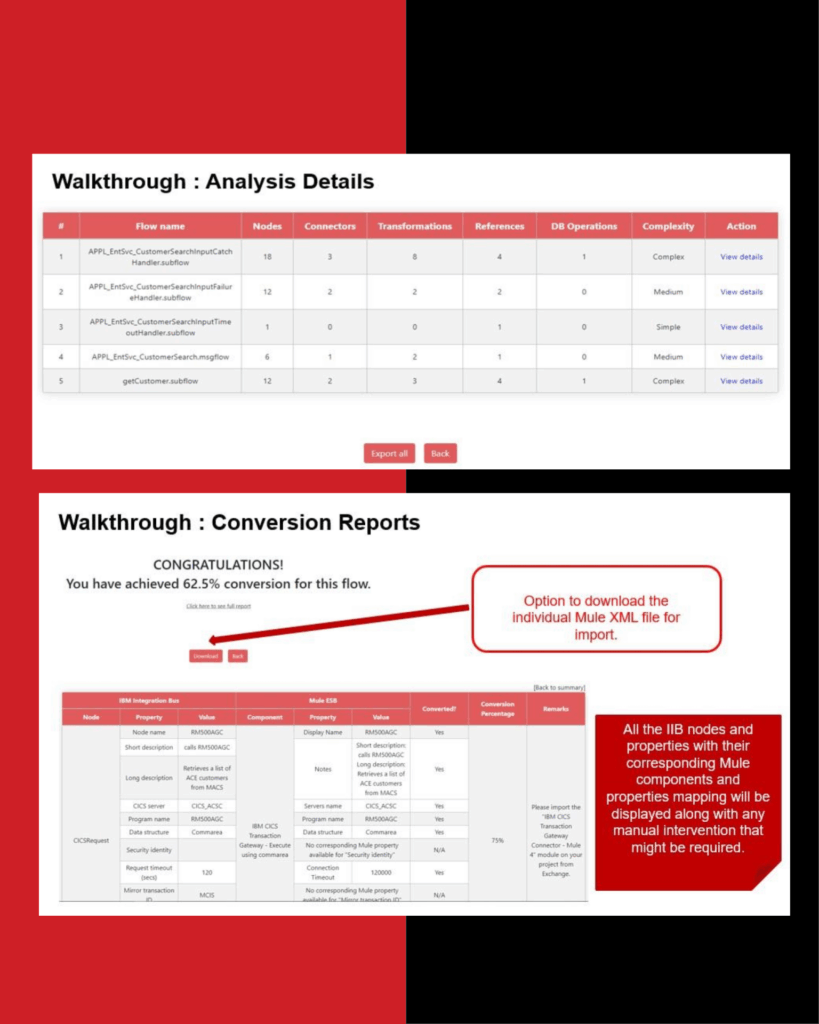 This report serves as a specification document to understand the legacy APIs and as the guide for the conversion of the flows to MuleSoft. Most of the time, the line Managers do not have any documentation on the complexity of the integration platform. Merely documenting the components, complexities and interdependencies can be an exercise spread across months. The Analysis that can normally take months of effort can be reduced to hours.