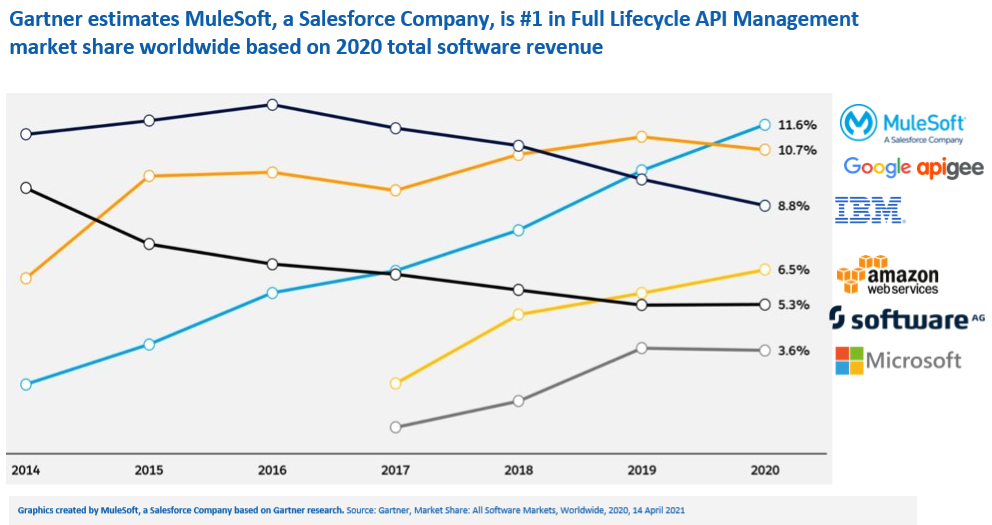MuleSoft and IBM compare closely in iPaaS capabilities. But IBM’s fragmented offering compared to MuleSoft’s single Platform, complicates IBM adoption by customers. This is causing the IBM integration platform a slower growth compared to the market expansion.